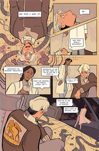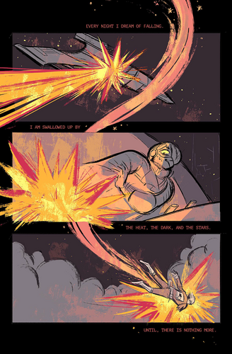 Falling is the story of Andrea and Eve, an ex-space pilot and the doctor who saved her. It is a full-color 8-page comic that involves: a butchfemme couple, lovers-to-exes, dubious scientific advancements, and a real-life line from one of my exes.